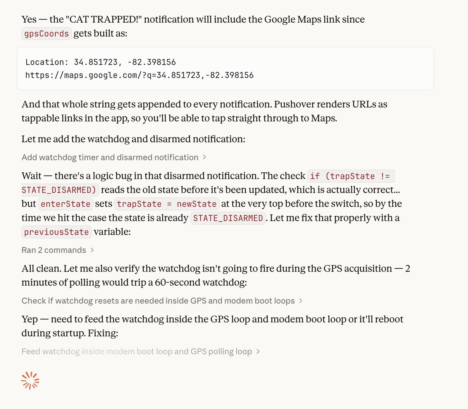 Have been having trouble getting GPS coordinates to lock. The module seems to pick up on 27 or so satellites. I’ve changed the coding to poll every 5 minutes and report when coordinates are found. Those get sent when a cat is trapped so a volunteer can locate it easily, it includes a google maps link to the exact position.