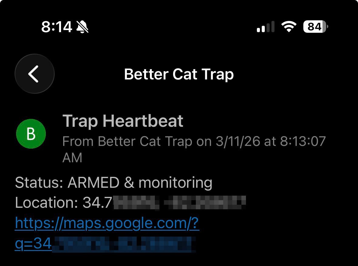 The trap is running successfully on it’s own, connecting to cellular and sending heartbeats and messages when the trap is armed and when it closes the trap.